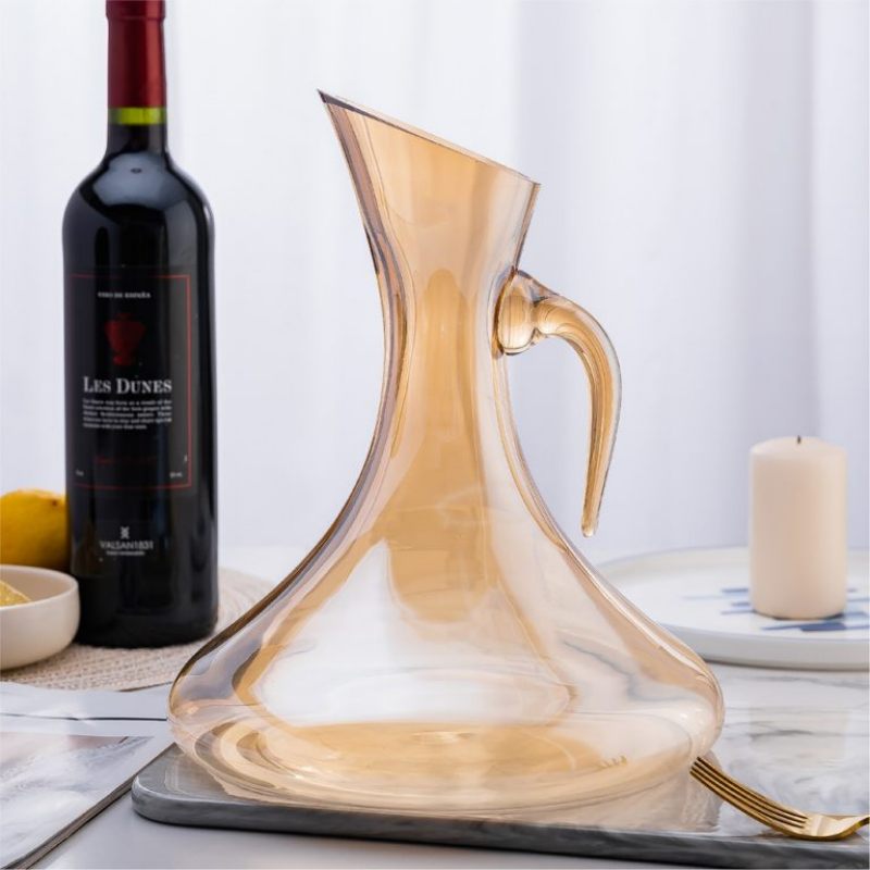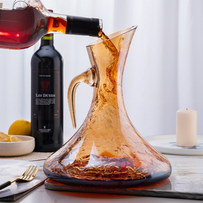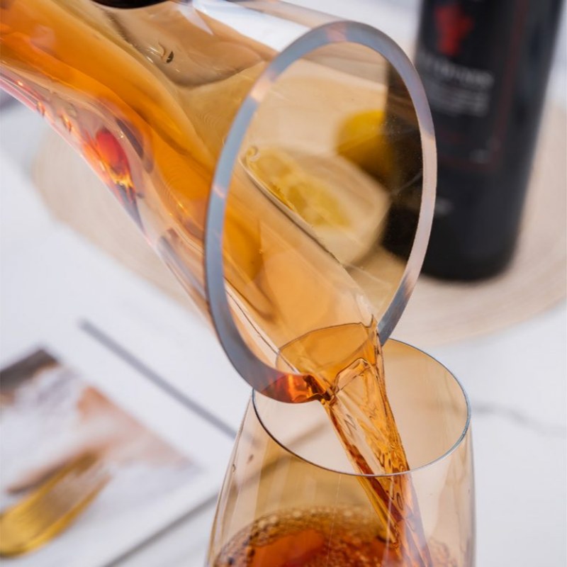 Bring elegance to your wine ritual with this 1500ml amber-plated glass decanter, where sculptural form meets practical function. Designed with a graceful curve and a tilted spout, it aerates red wine beautifully while serving as a centerpiece for any table. The warm amber hue and crystal clarity evoke sophistication, making it perfect for upscale dining, gifting, or curated barware collections. With OEM flexibility and single-piece availability, this decanter is tailored for brands and buyers who value both aesthetics and performance.