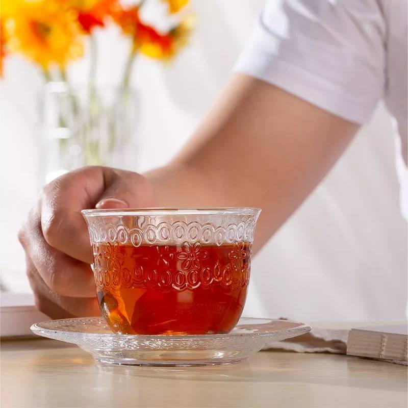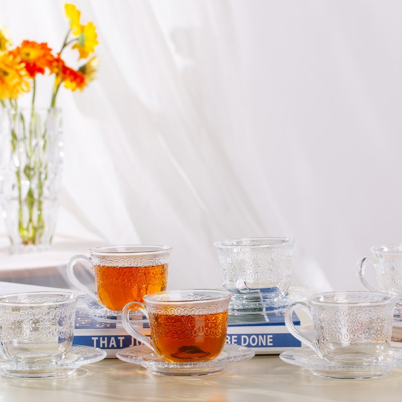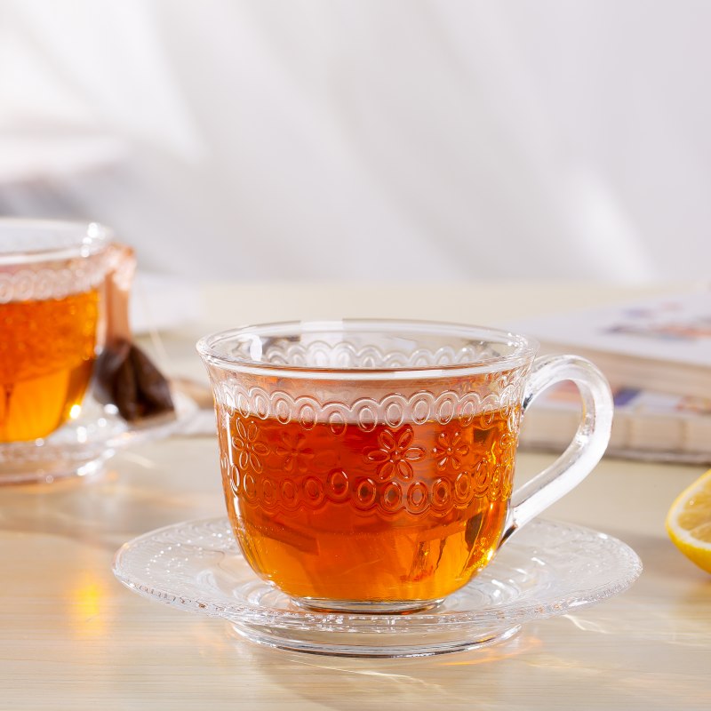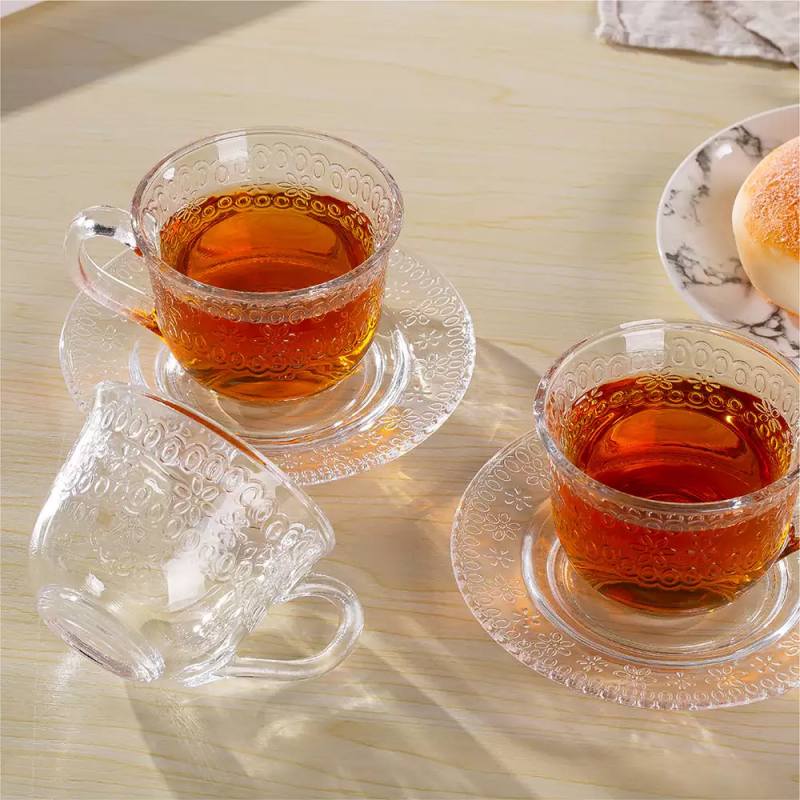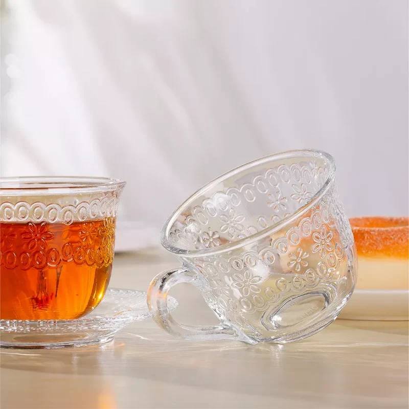 190ml Embossed Glass Coffee Cup with Saucer – Clear Soda Lime Glass Tea & Coffee Set for Daily Use & Wholesale