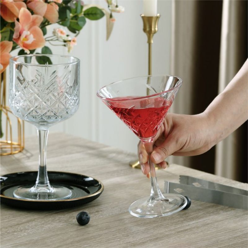 This 230ml vintage martini glass features a beautifully carved bowl with geometric and leaf‑style cut patterns that create a sparkling, light‑reflecting effect. The wide 117mm rim enhances aroma release, making it ideal for classic martinis, margaritas, cosmopolitans, and modern craft cocktails. Made from lead‑free crystal, the glass ensures safety, clarity, and durability. The tall 173mm stem provides an elegant profile while keeping hands away from the bowl to maintain drink temperature. Each set of 4 is packaged in export‑safe cartons, with optional custom gift boxes for retail and private‑label programs.