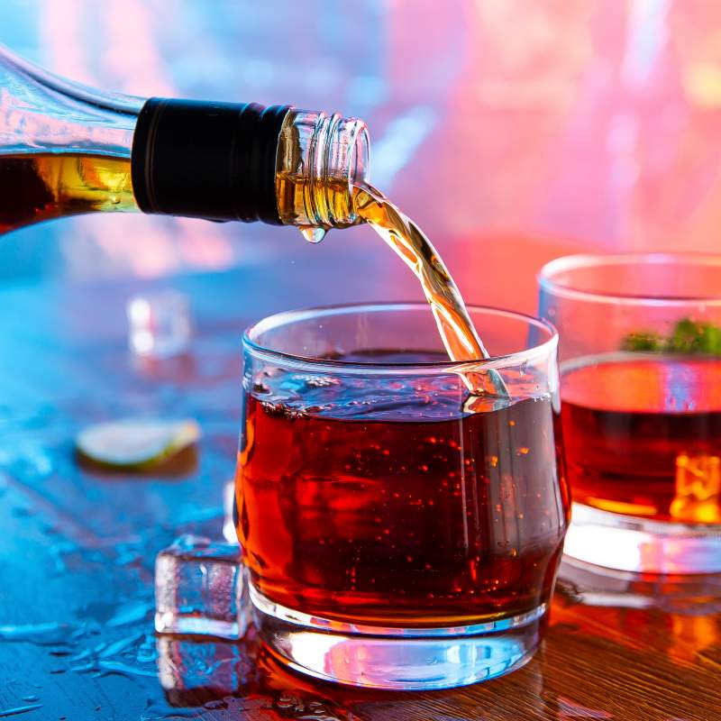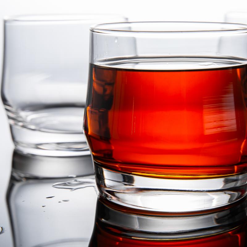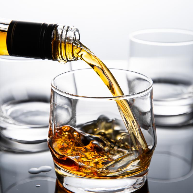 زجاج صودا كلسي عالي الشفافية لإطلالة أنيقة وعصرية تُبرز المادة الشفافة لون الويسكي والمشروبات الأخرى، مما يعكس الجمالية الواضحة والبسيطة الشائعة في أدوات البار المعاصرة.