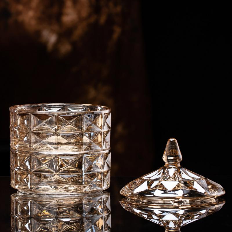 Made from soda lime glass with a plated finish, the XHDSTG1055DL amber glass candy jar set delivers a premium solution for decorative storage. Each jar features a diamond-cut texture and a matching lid with finial, combining elegance and function. Ideal for candy buffets, hotel displays, or retail decoration, this 2-piece glass jar set enhances interiors with its amber hue and timeless form. Suitable for storing candy, jewelry, or small accessories.