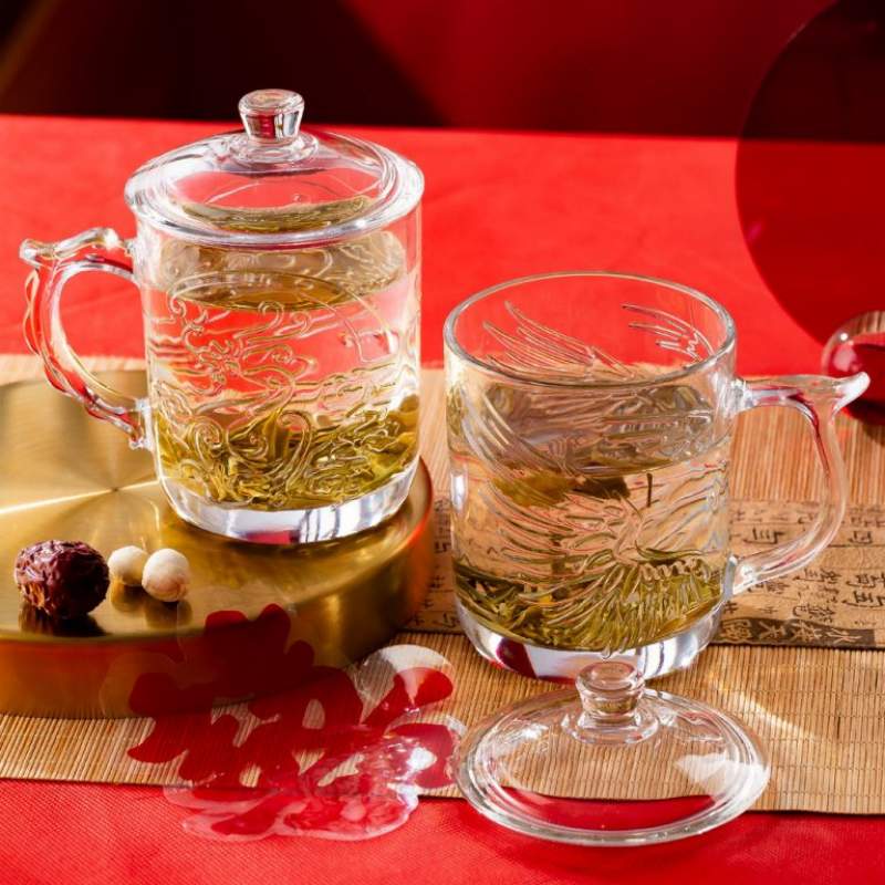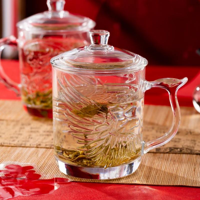 كوب شاي زجاجي شفاف مع غطاء - 425 مل بنقشة أجنحة فنية، توريد بالجملة لقطاع الضيافة