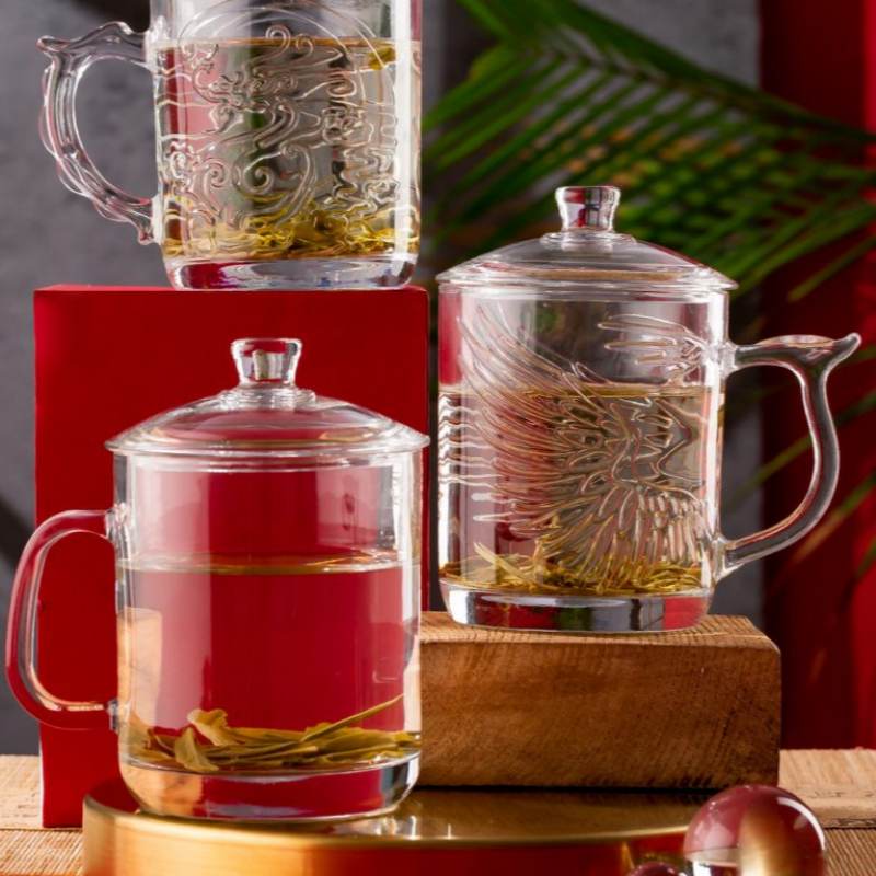 هذا كوب زجاجي سعة 425 مل مع غطاء مصنوع من زجاج صودا-جير أبيض عاليتتميز هذه القارورة بنقاء استثنائي، ومتانة عالية، ومقاومة للحرارة، مما يجعلها مثالية للاستخدام التجاري اليومي. يضفي نقش التنين والعنقاء البارز عليها لمسة جمالية راقية، مع الحفاظ على هيكل متين وعملي مناسب للمقاهي والفنادق وبيئات العمل. يساعد الغطاء المحكم على الحفاظ على درجة الحرارة والرائحة، مما يجعلها مثالية لشاي الأوراق السائبة، ومشروبات الأعشاب، والمشروبات الساخنة.