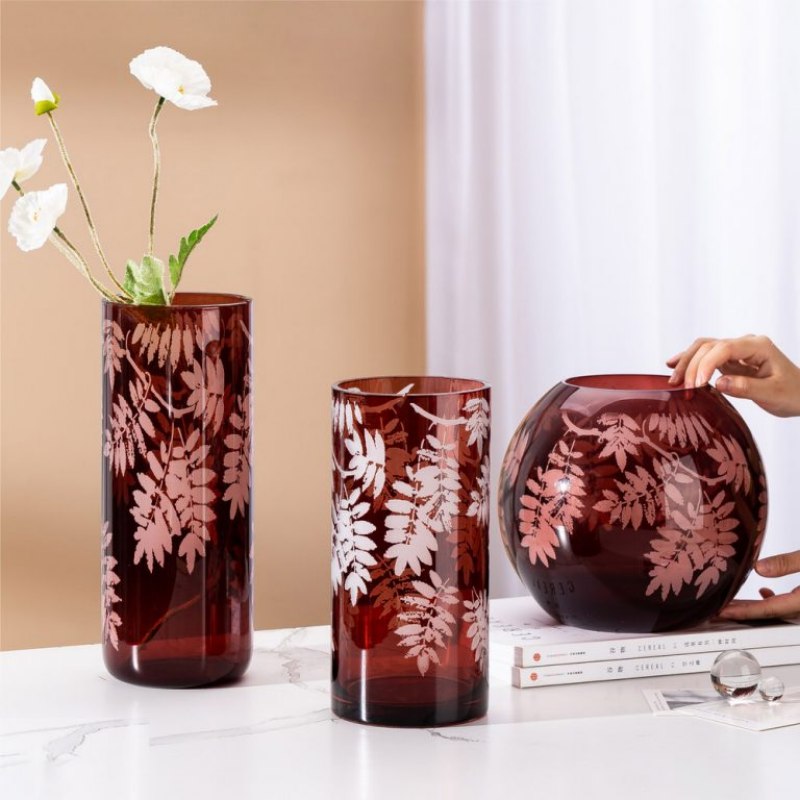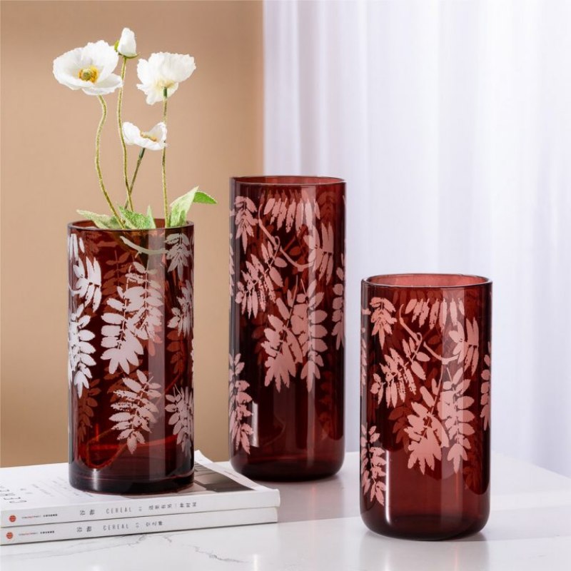 مزهرية زهور زجاجية حمراء أصلية - أسطوانية طويلة، بنقشة أوراق الشجر، توريد بالجملة لقطاعي التجزئة والضيافة