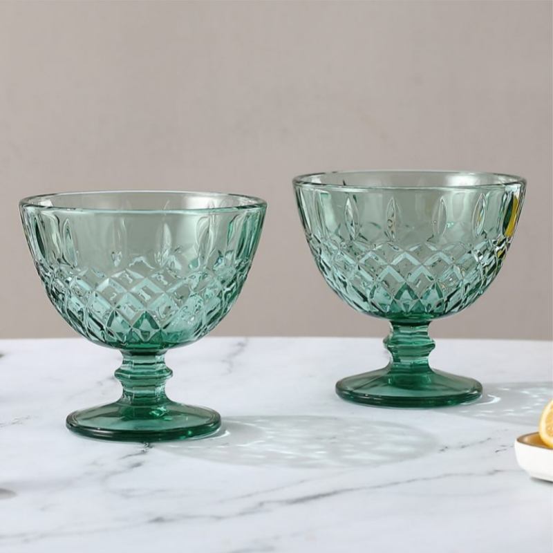 قم بتقديم أطباق أنيقة مع كل حلوى باستخدام أوعية الزجاج الخضراء ذات الطراز القديم. يتميز هذا الوعاء ذو القاعدة بقطع ماسي وحافة علوية بيضاوية، ويجمع بين سحر الماضي ومتانة العصر الحديث. مصنوع من زجاج سميك مضغوط، وهو مثالي لتقديم الآيس كريم والفواكه والحلويات في المطاعم والفنادق وقاعات المناسبات. متوفر للطلبات بالجملة وبعلامة تجارية خاصة بالمصنعين الأصليين، وهو مثالي للموزعين الذين يبحثون عن أدوات مائدة أنيقة وعملية بلمسة خالدة.
