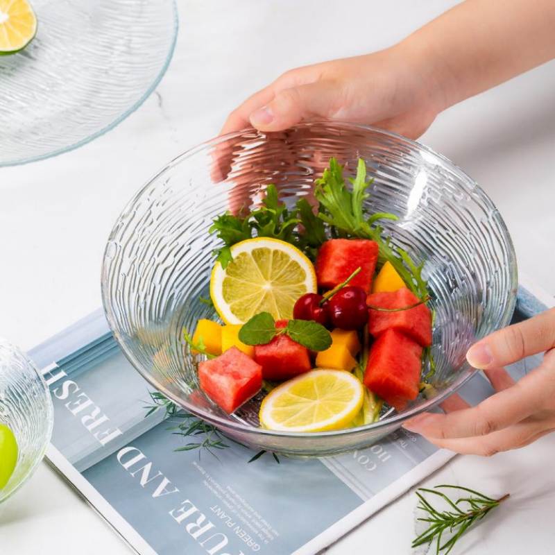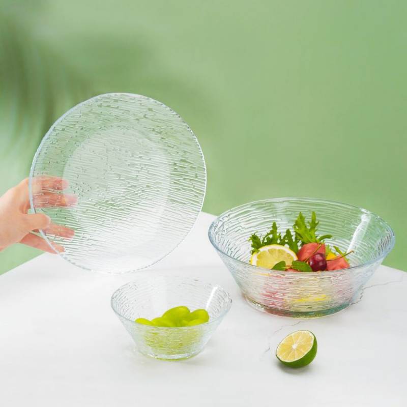 تم تصنيعها بدقة، هذا وعاء زجاجي مزخرف يجمع الشفافية والملمس لتحسين عرض الطعام. خطوط أفقية محفورة تعكس الضوء بشكل جميل، مما يخلق جوًا راقيًا لتناول الطعام. سواء تم استخدامها كـ وعاء الفاكهة في عروض البيع بالتجزئة أو كـ وعاء التقديم في أماكن الضيافة، فهو يعزز كلاً من الأداء الوظيفي والجمالي. باختيارنا مجموعة الأواني الزجاجية بالجملةلا تقدم علامتك التجارية التطبيق العملي فحسب، بل توفر أيضًا بيان نمط الحياة الحديث للعملاء في جميع أنحاء العالم.