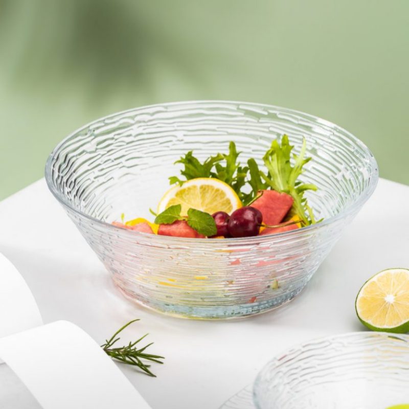 ملكنا وعاء زجاجي شفاف ذو ملمس مميز تم تصميمه ل المطاعم والفنادق وشركات تقديم الطعام نبحث عن حلول تقديم متينة وأنيقة. بفضل فتحة واسعة وقاعدة مستقرةهذا الوعاء مثالي لتقديم السلطات أو الفواكه أو الحلويات في أجواء احترافية. نمط الخط المحفور يضيف لمسة عصرية، مما يجعله مناسبًا لتناول الطعام غير الرسمي والمناسبات الراقية. متوفر في البيع بالجملة، فهو يضمن إمدادًا ثابتًا وكفاءة التكلفة لشركتك.