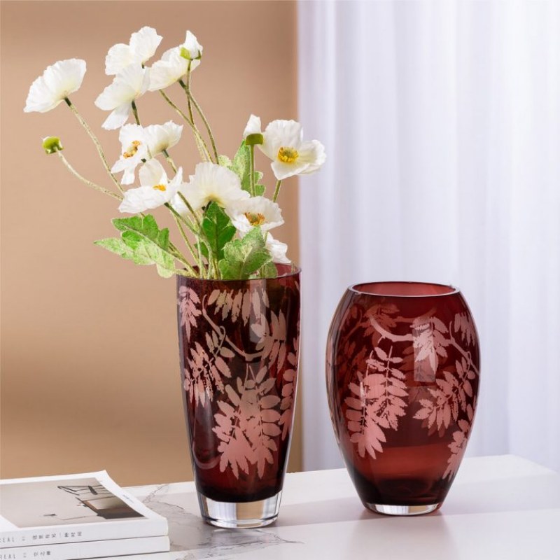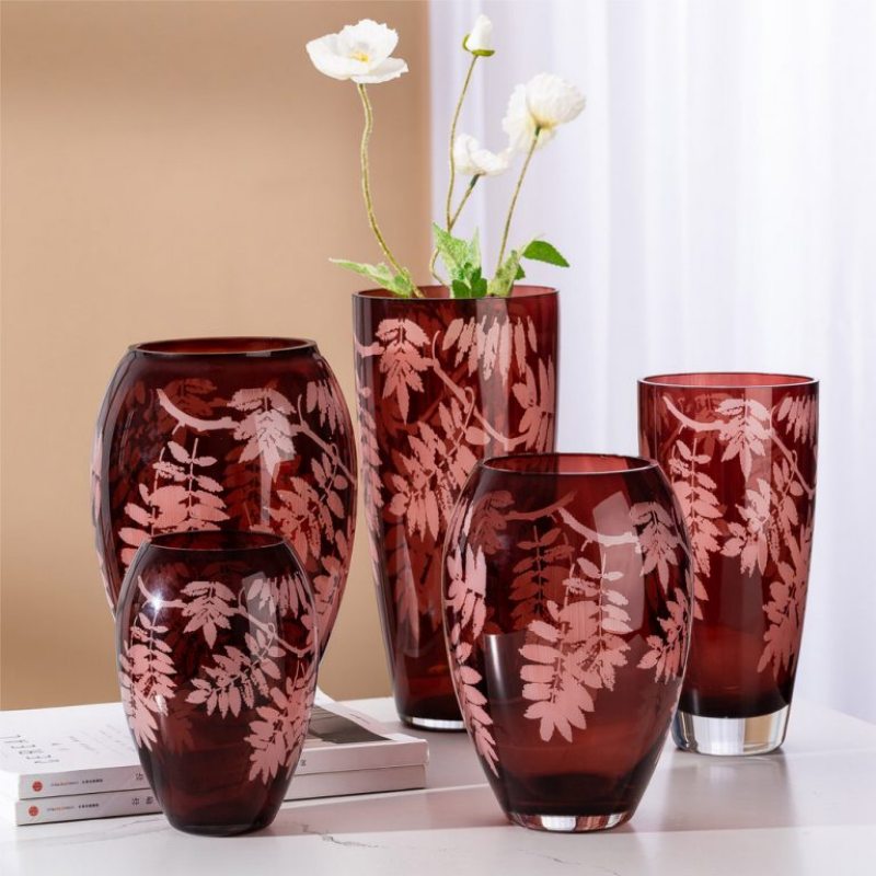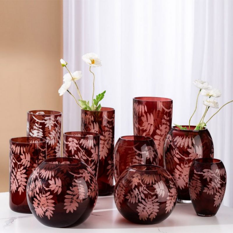 مزهرية زجاجية بالجملة - لون أحمر صودا ليموني، بنقشة أوراق فنية، قطعة مركزية لتزيين المنزل