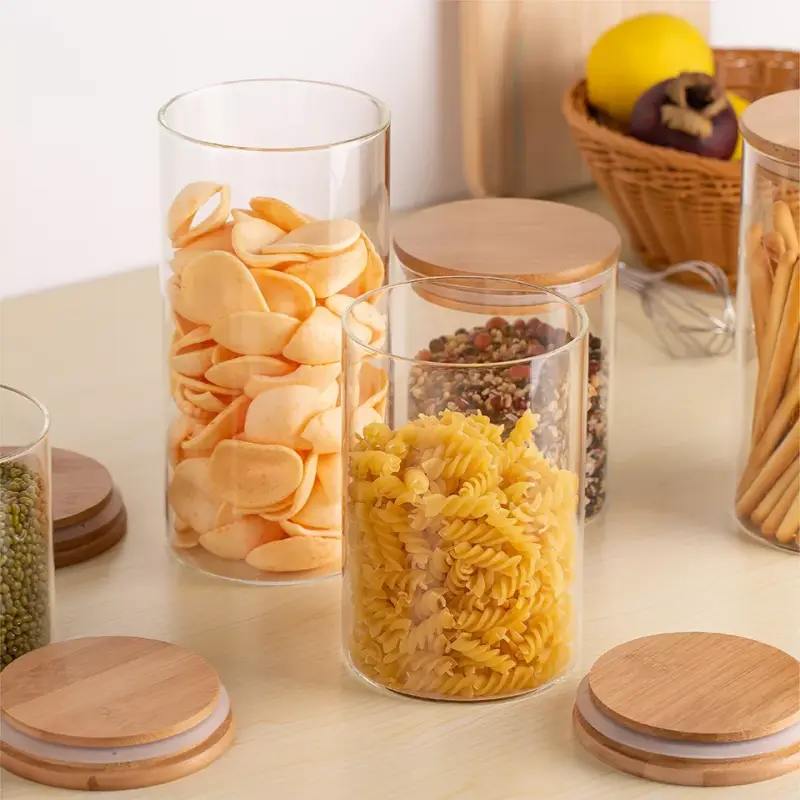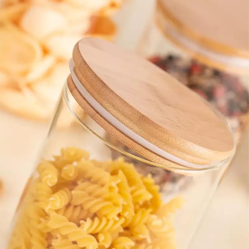 برطمان زجاجي شفاف للبيع بالجملة بغطاء خشبي - مثالي للتوابل والشاي والقهوة