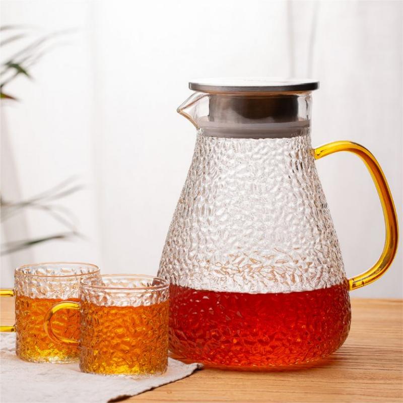 The XHGPH41‑L5 5‑Piece Drinkware Set includes a 1600ml hammered borosilicate glass pitcher with a stainless steel lid and four matching glass cups featuring colored handles. The hammered texture enhances grip and visual appeal, while the borosilicate construction ensures heat resistance for both hot and cold beverages. This set is ideal for cafés, restaurants, lifestyle retailers, homeware brands, and gift‑set programs. Standard packaging is 1×5, optimized for wholesale distribution.